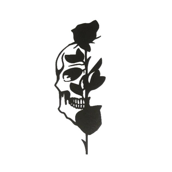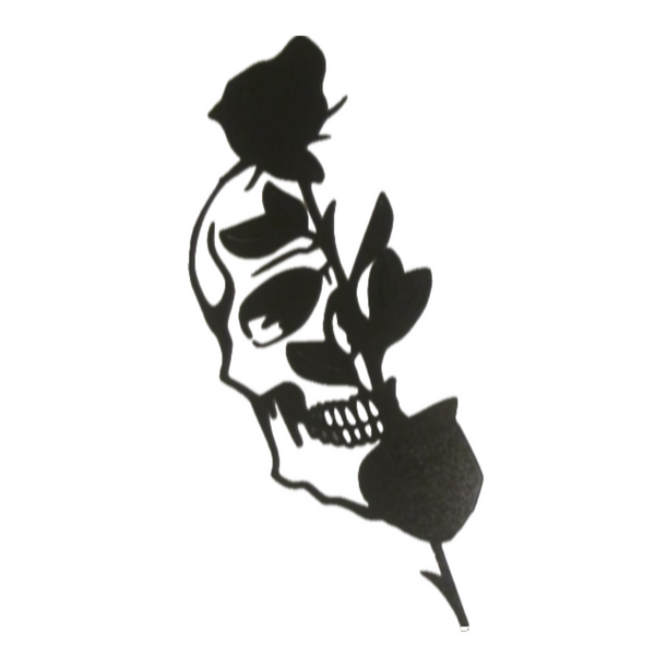 Half Skull and Black Rose Metal Wall Art is cut from 16 gauge steel. It is approximately 18 inches high by 7 inches wide. The half skull can be hung on your hanging surface straight up or on the vertical. It looks amazing either way.
